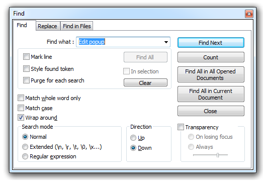 Each of these options will open the corresponding tab in the Find/Replace dialog. This dialog will always stay on top of the text, but you can still keep on editing the text if it's opened, and you can set it to be transparent (using the Transparency option) when its inactive (On lose focus) or at all times (Always). The slider controls the amount of transparency. Note that transparency is only available on Windows 2000 and later.